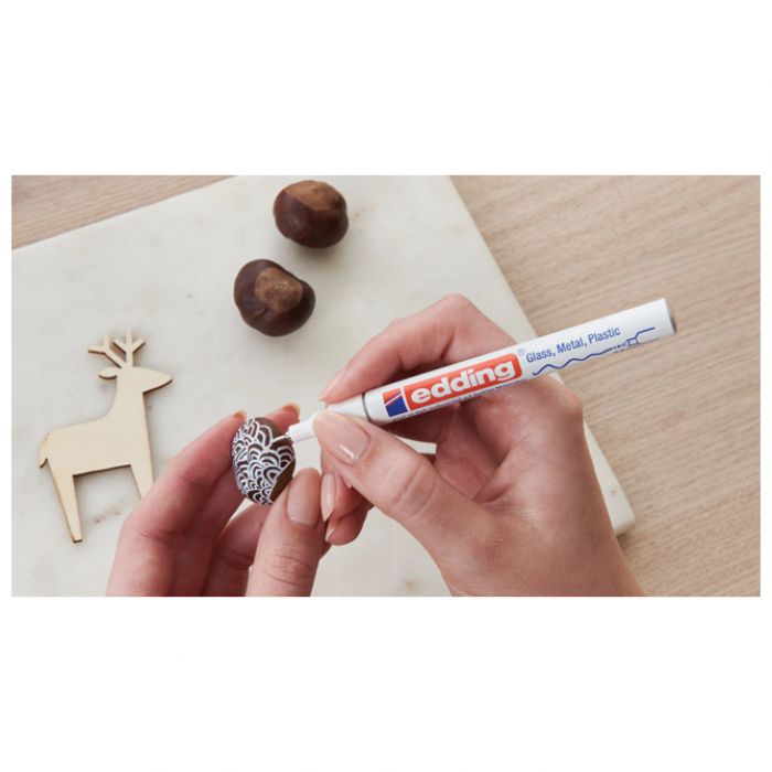Specifikacija: permanentni; lakirajući; sjajni; okrugli vrh; aluminijsko kućište; širina ispisa 0,8 mm; visoka neprozirnost; ne ostavlja mrlje; za pisanje i dekoriranje na glatkim, tamnim i prozirnim materijalima (npr: staklu, metalu, plastici, papiru s premazom…); brzo se suši; dobro podnosi atmosferske utjecaje; otporan na trošenje (habanje); tinta nema intenzivan miris