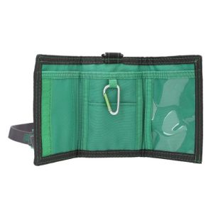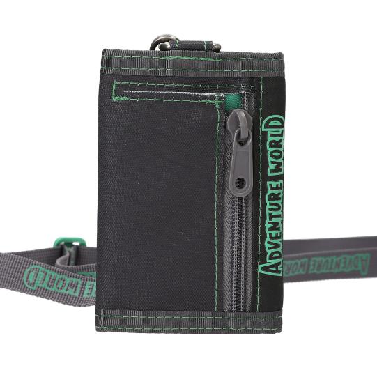 - Sa zelenim detaljima, odvojivom dugom vrpcom, velikim karabinerom za ključeve, pretincem s patentnim zatvaračem za kovanice, pretincem za novčanice i raznim pretincima za kartice, uključujući pretinac s prozirnim prozorčićem