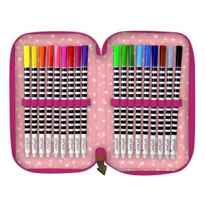 - punjena s 45 komada pribora: flomaster školski 18 boja, boje drvene 18 boja, olovka grafitna HB, šiljilo, gumica, ravnalo 15 cm, trokut