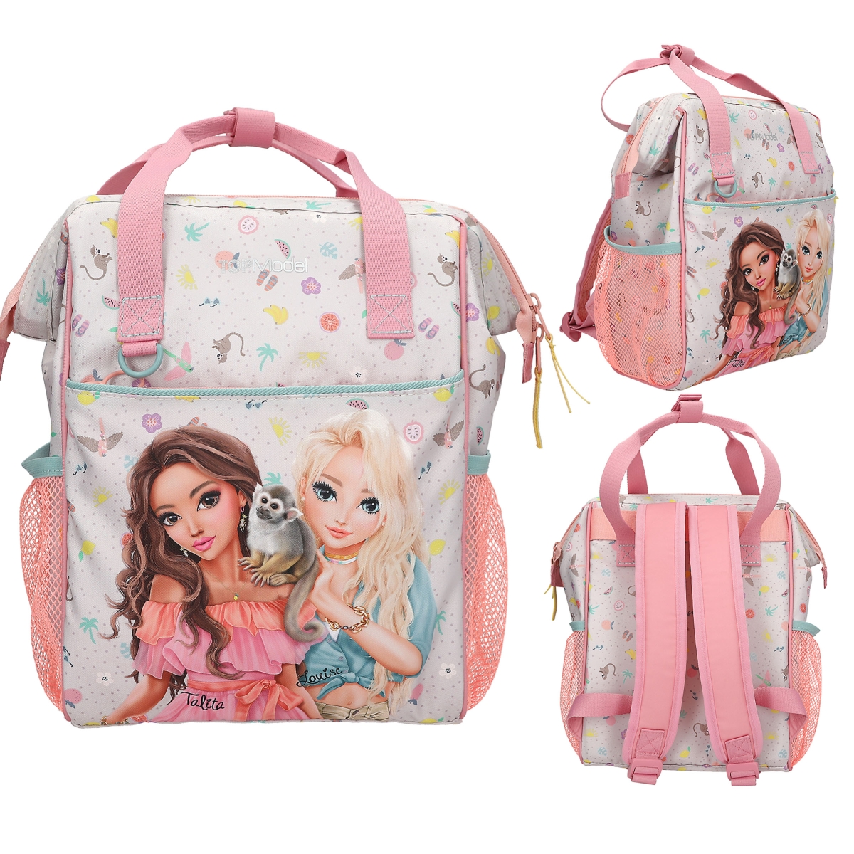 - Ruksak marke TOP Model ima odličan dvostruki motiv s malim majmunom na ravnom prednjem džepu i veselim printom malih točkica, cvijeća, voća, majmuna, ptica, palmi i ljetnih dodataka sa svih strana